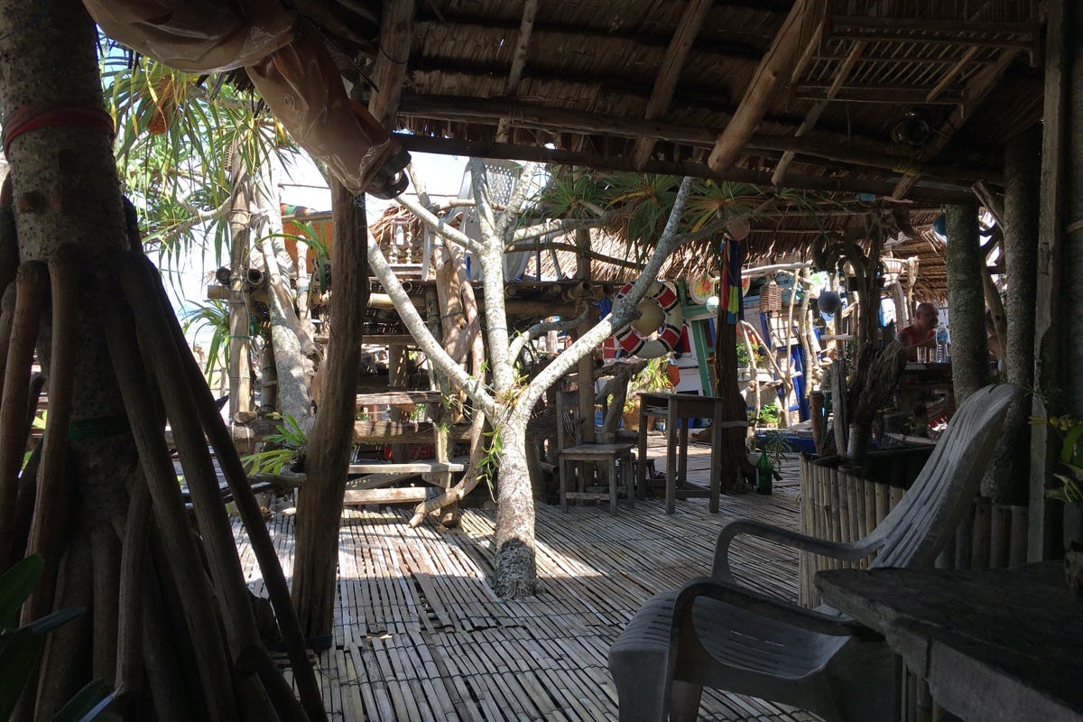 About halfway back to the main pier, there is a rustic beach bar. I look closely and realise it is actually a boat bar, or a bar built around something that was once a boat. There’s not a straight angle in the place, full of nooks and crannies, seating in strange little decks and up on high platforms. If you’ve ever had the misfortune of watching Waterworld, they could have filmed the entire movie here.