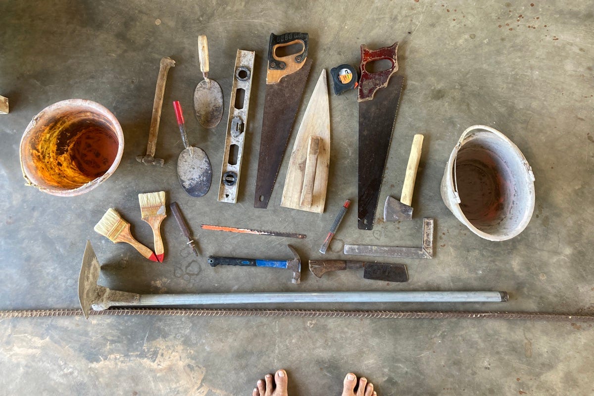 Inventiveness through necessity. The builders’ entire tool set. Photo: Stuart McDonald.