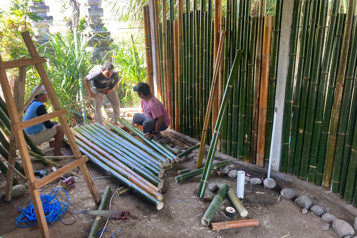 With Agung’s help—and at my instruction—we source a local building team. From two villages very close at hand, these guys know how to mix concrete, and at that they excel. While I need that talent, I also want a staggered and curving bamboo wall for a far larger bathroom. One of the team has worked with bamboo before, though never a curving, multi-section wall. He reckons it won’t be too much more complicated and I agree. We are both wrong.