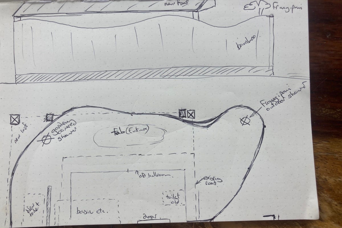 While Agung “searches in the jungle for bamboo he likes,” the team busy themselves on the wall base and piping. I want to move the toilet and have two showers, one at either end. At the prompt of another, I asked after P-traps. P whats you ask? Yeah, same—it is to be one of many terms I learn that I wish I never needed to. After I sketch one out (thanks Google) the builders confess to having no idea, nor any idea where to buy them. Not for the last time, they improvise, building them out of pipe joins to make the same. Over and over their inventiveness impresses—as does their willingness to do things over as needed. In general, three times is a charm.