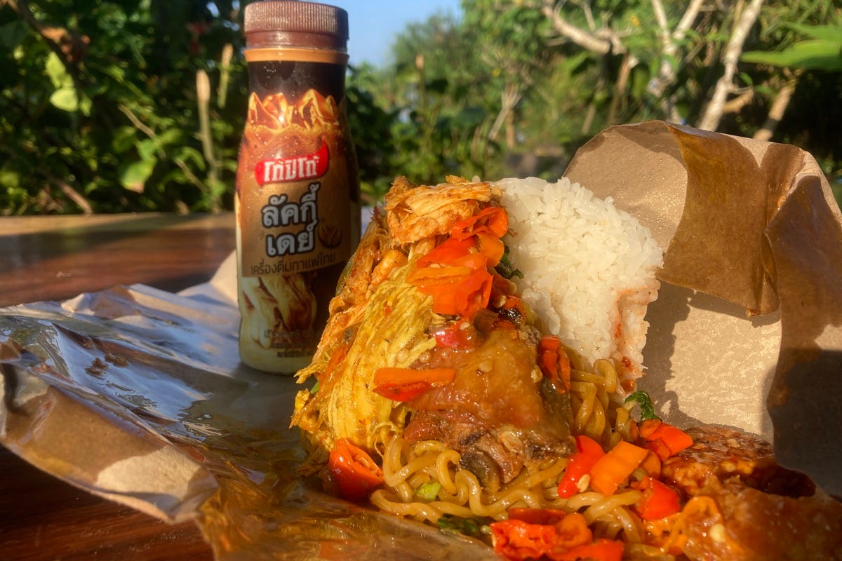 Food wise, as I mentioned the other day, the shack kitchen is good for nothing but boiling water for coffee. Near all my meals come from a local babi guling warung or a line of nasi warungs up at the temple. The food is, I think without exception, all sourced locally.