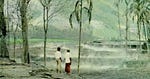 One is on the second floor, its open-plan overlooks a gurgling river below, and through a grove of trees, rice fields stretch out in the afternoon light. The second is a loft-style room, reached by a steep bamboo ladder. The views are elevated and impressive and apparently include the volcano in clear weather. For ease of access, we go with downstairs.